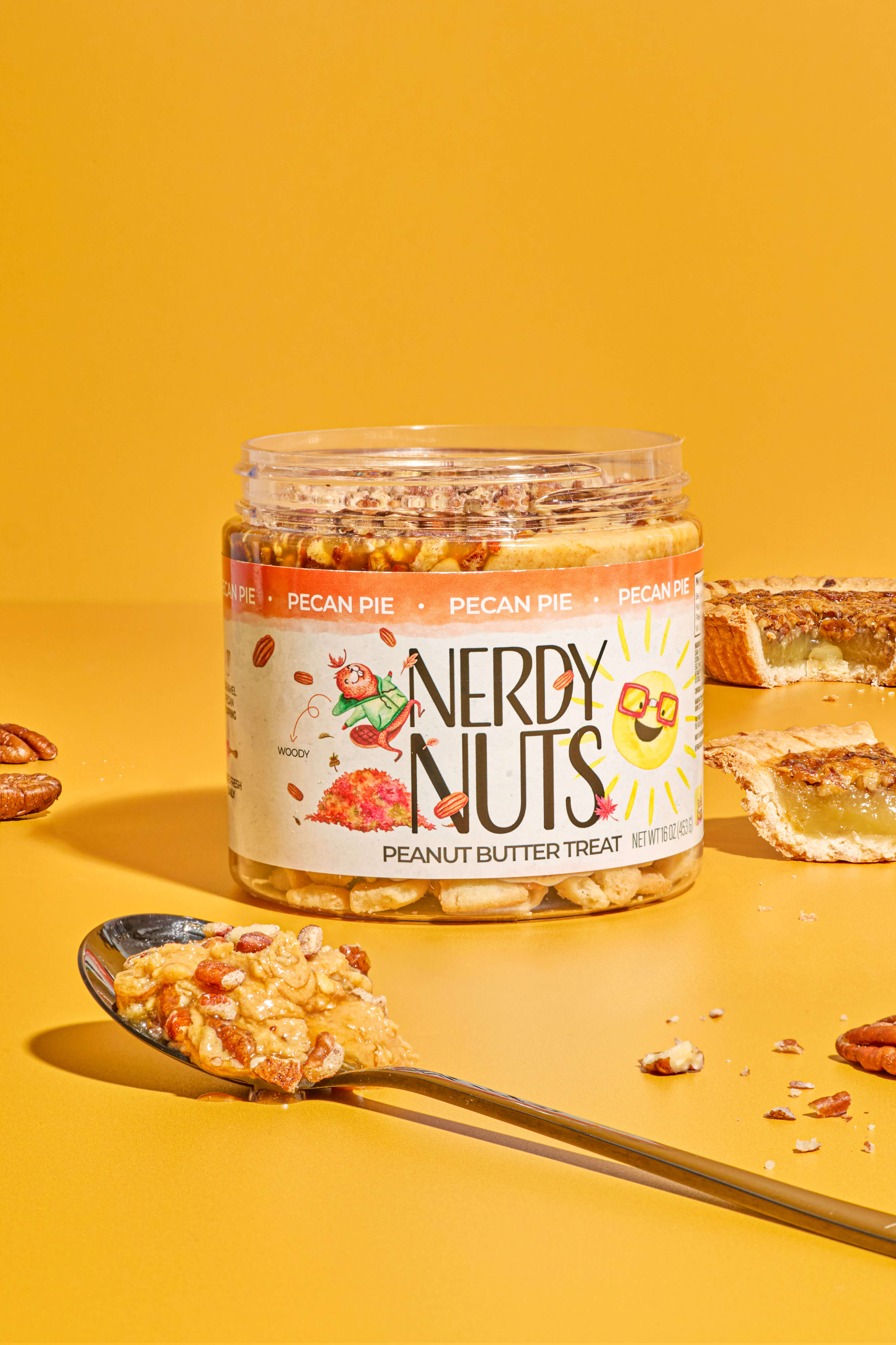 Brown sugar honey roasted peanut butter is layered on a pie chip crust, swirled with thick caramel pecan topping, and finished with chopped pecans! Slices of sweet and gooey heaven in every bite!