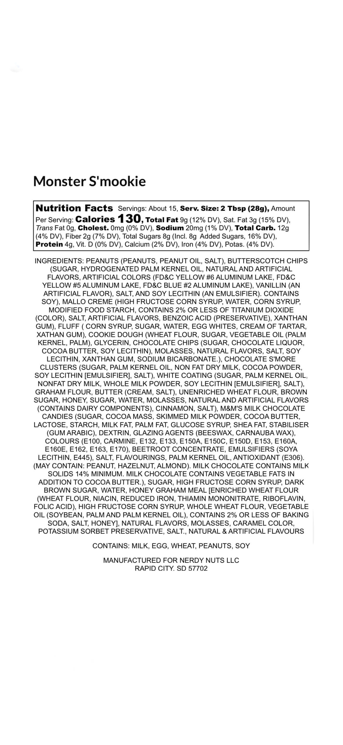 Butterscotch peanut butter is layered on fluff & toasted marshmallow graham mallow creme, topped with rainbow chocolate-covered gems, cookie dough, & s'mores clusters! Monster Cookie S'more!