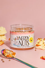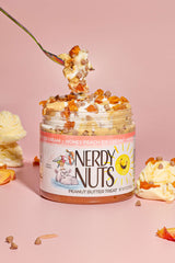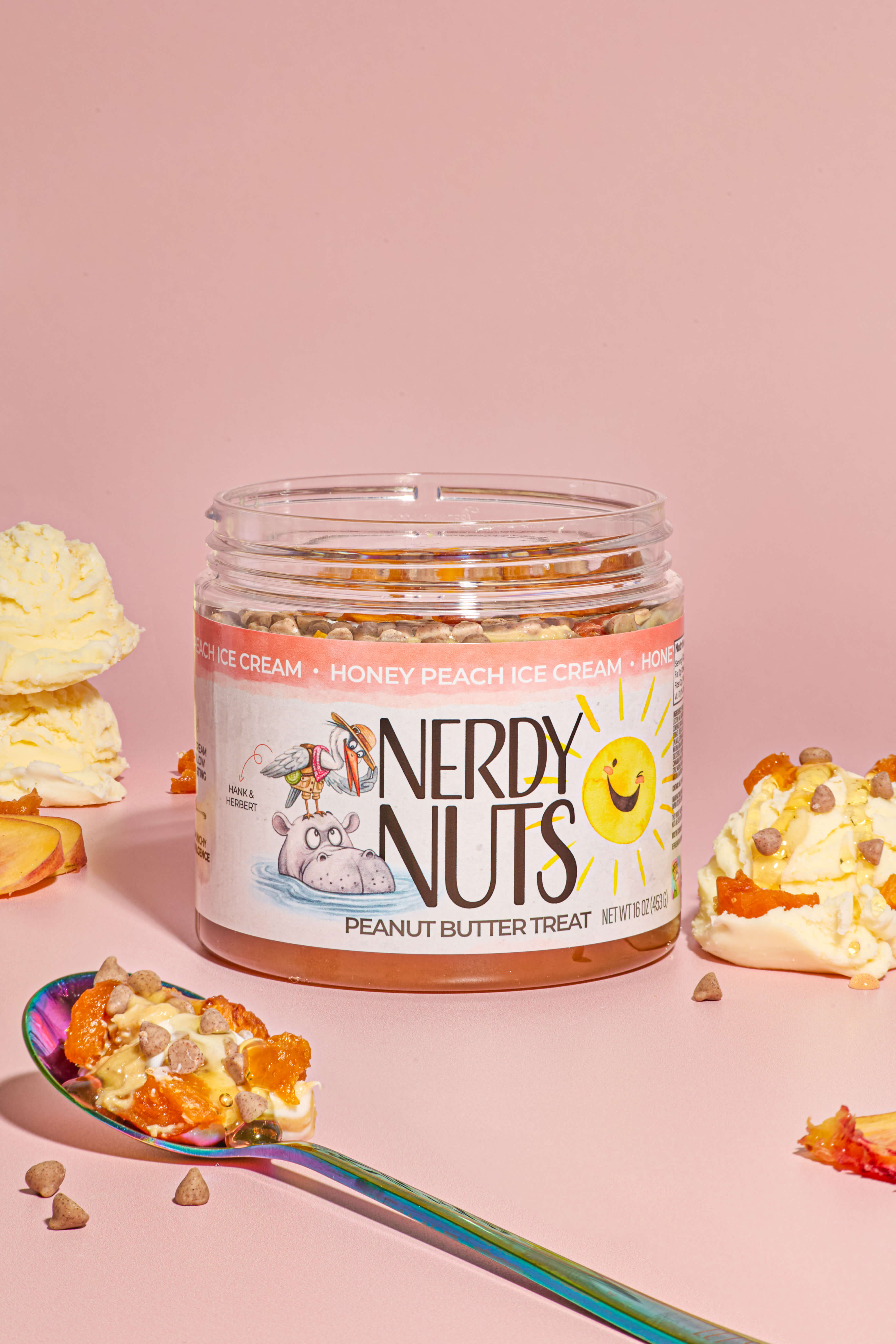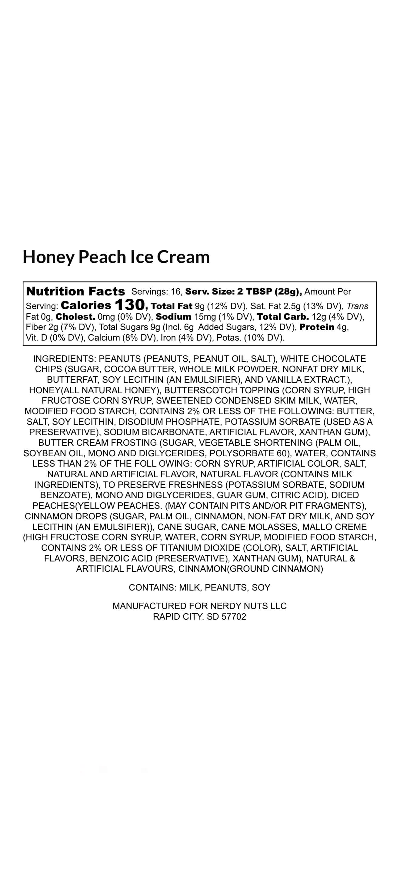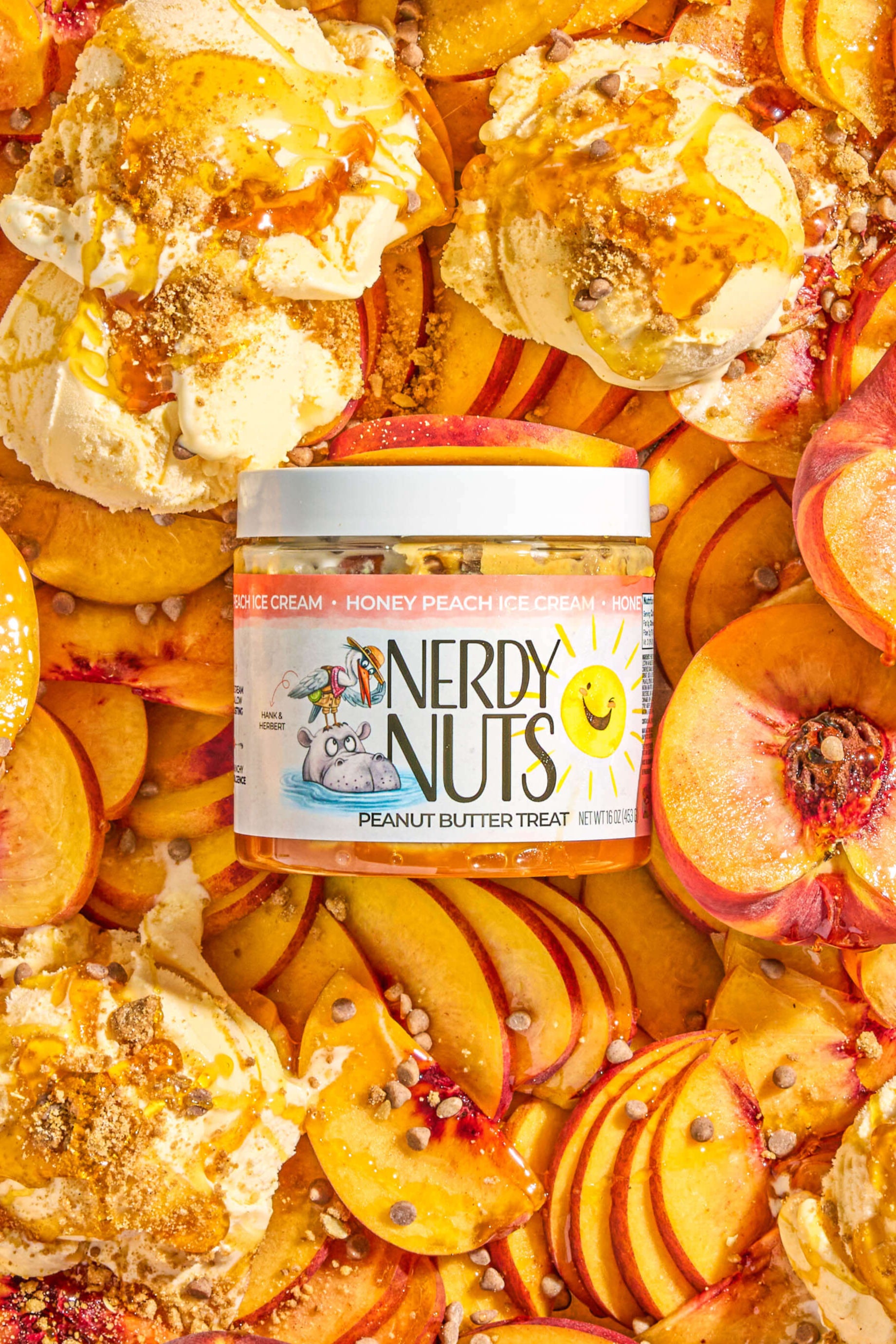 “Smunchy” cinnamon brown sugar peach-infused peanut butter is layered on buttery peach honey, topped with diced peaches, cinnamon chips, & ice cream frosting!