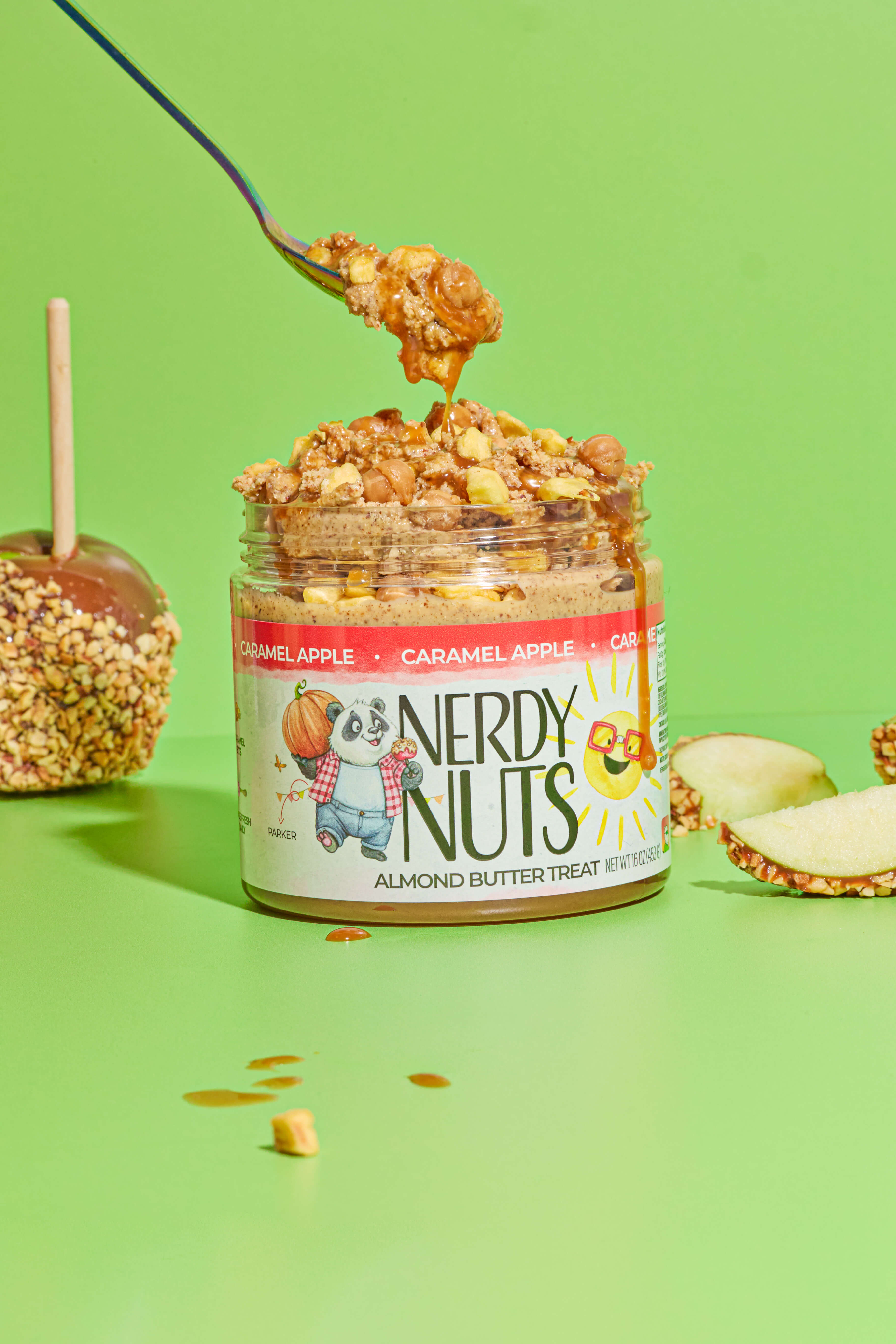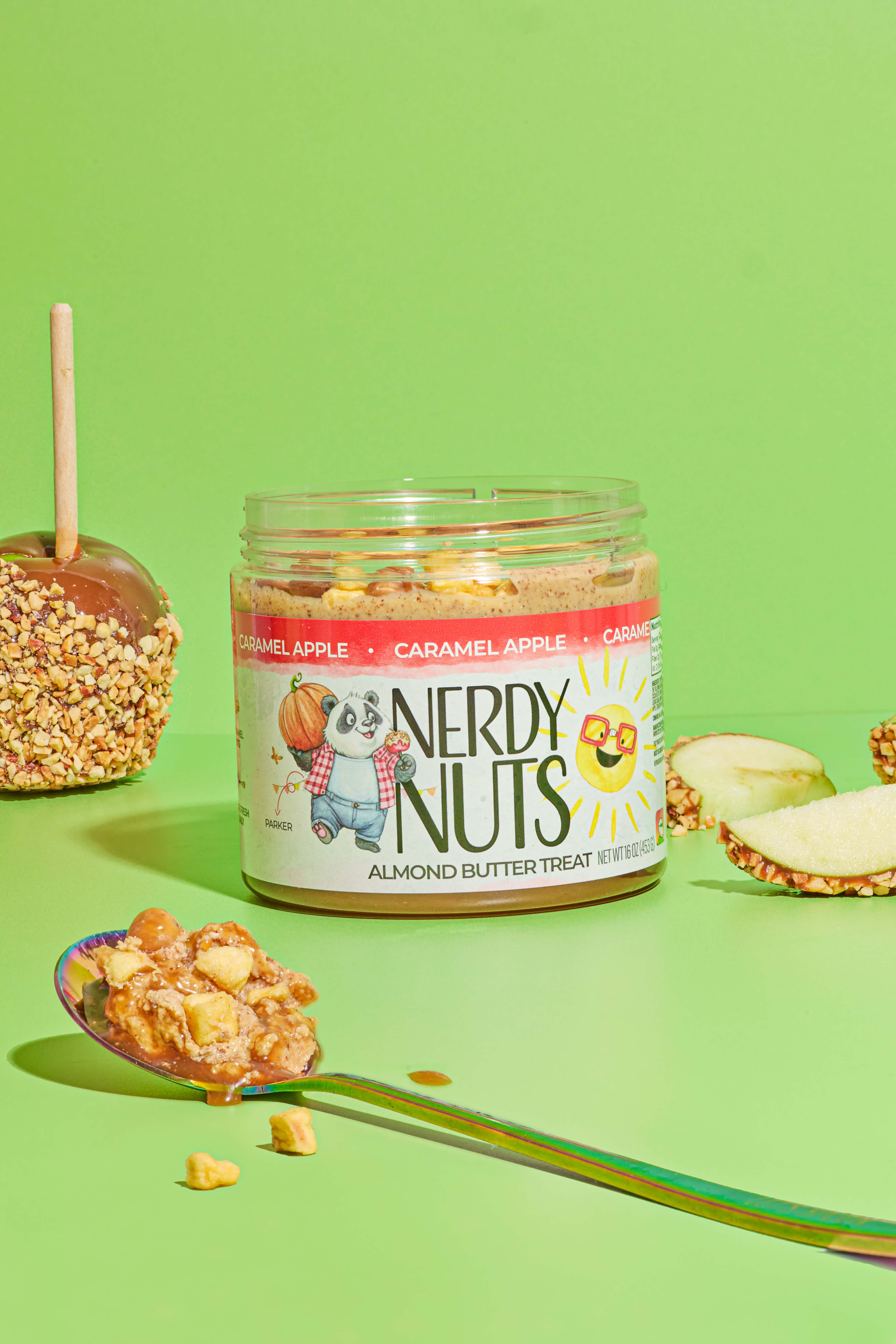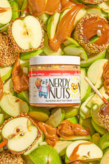“Smunchy” apple white chocolate almond butter is layered on gooey & tart caramel apple topping, topped with caramel bits & dried apples!