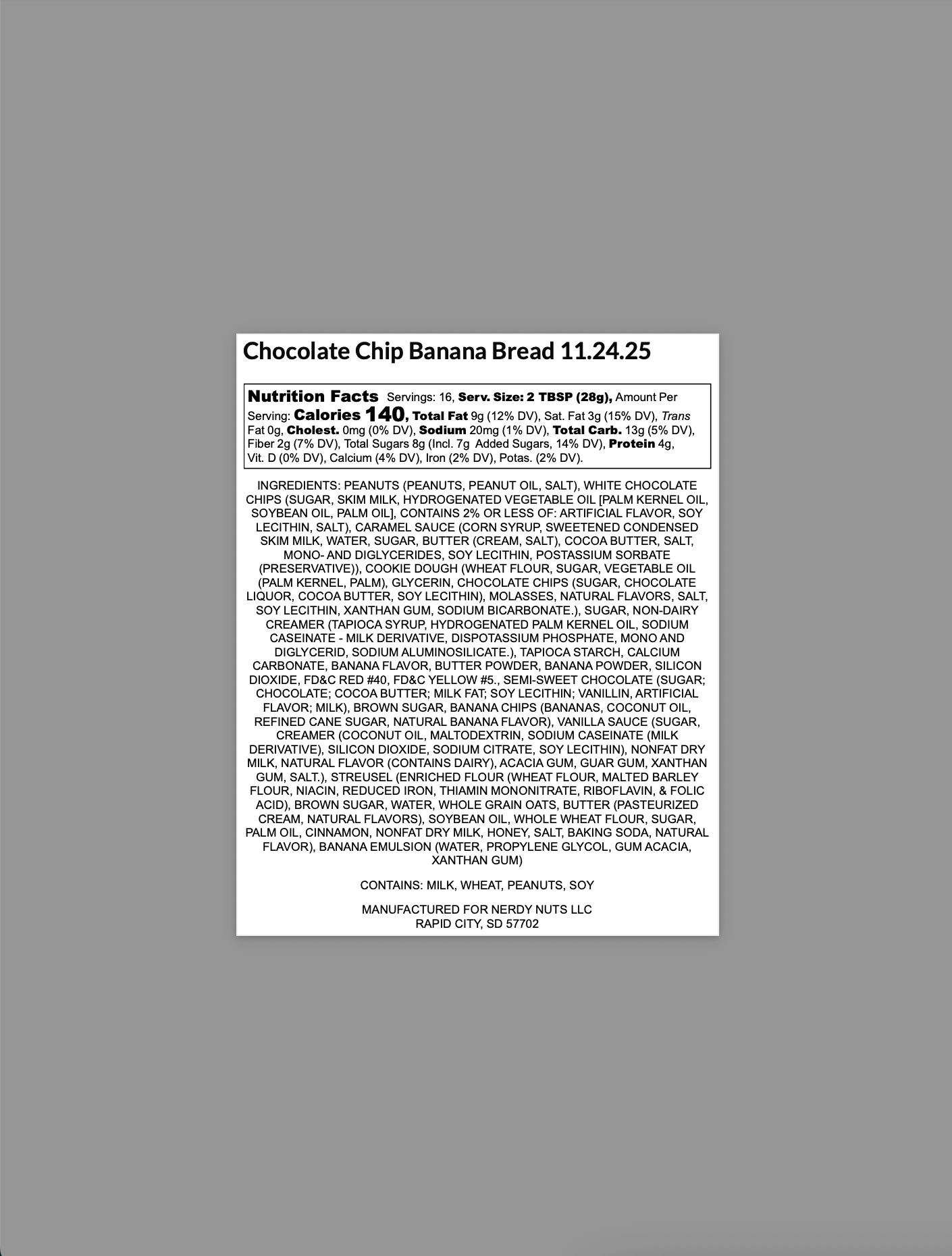 Brown sugar banana peanut butter is layered on caramel banana bread flavored sauce, topped with cookie dough, chocolate chips, banana chips, and cinnamon streusel!