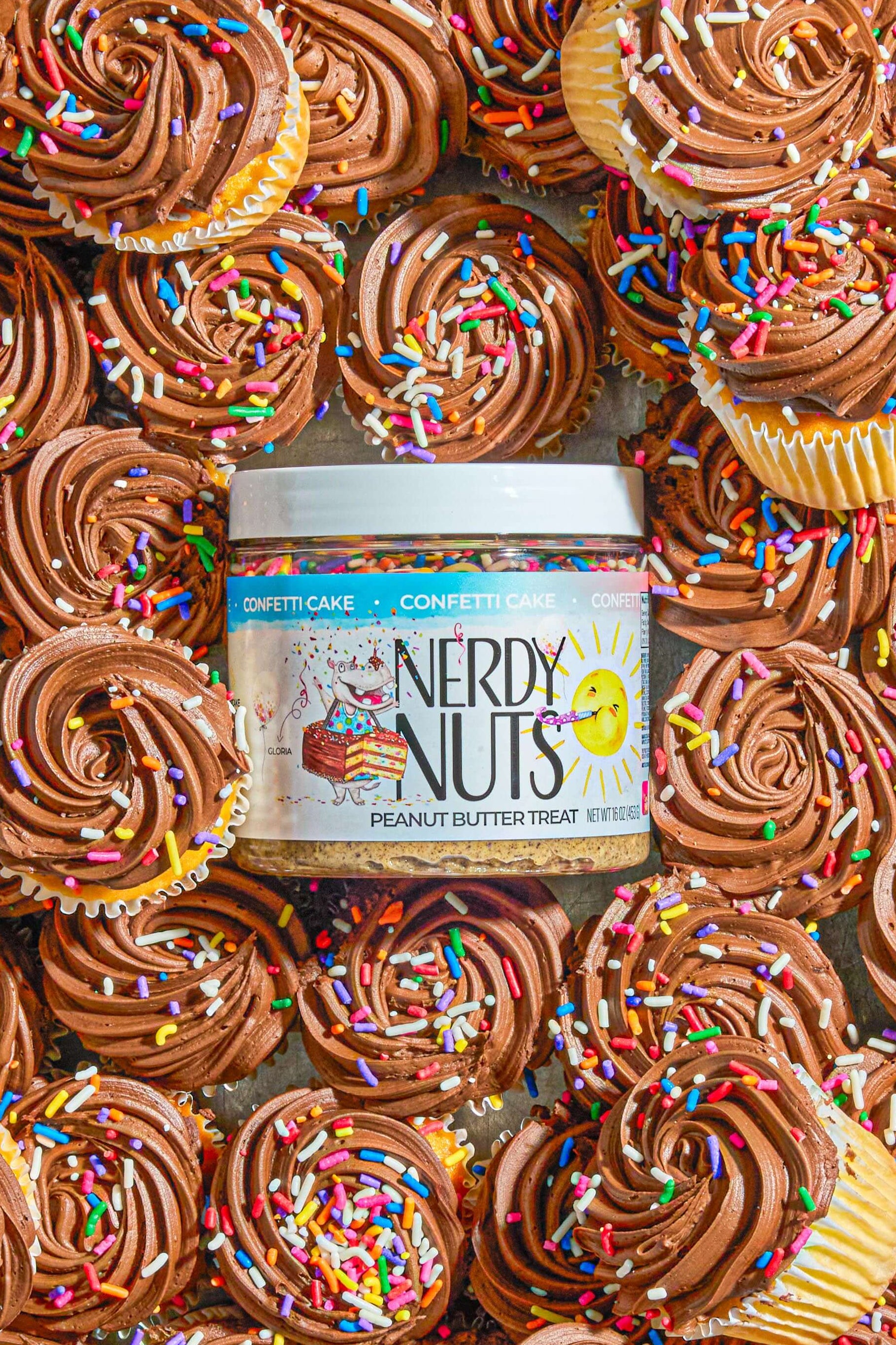 Confetti Cake starts with sweet honey white chocolate peanut butter with OREOS and cake bites blended into the base. We wanted to celebrate BIG, so we topped it off with chocolate frosting, sprinkles, and more cupcake bites!