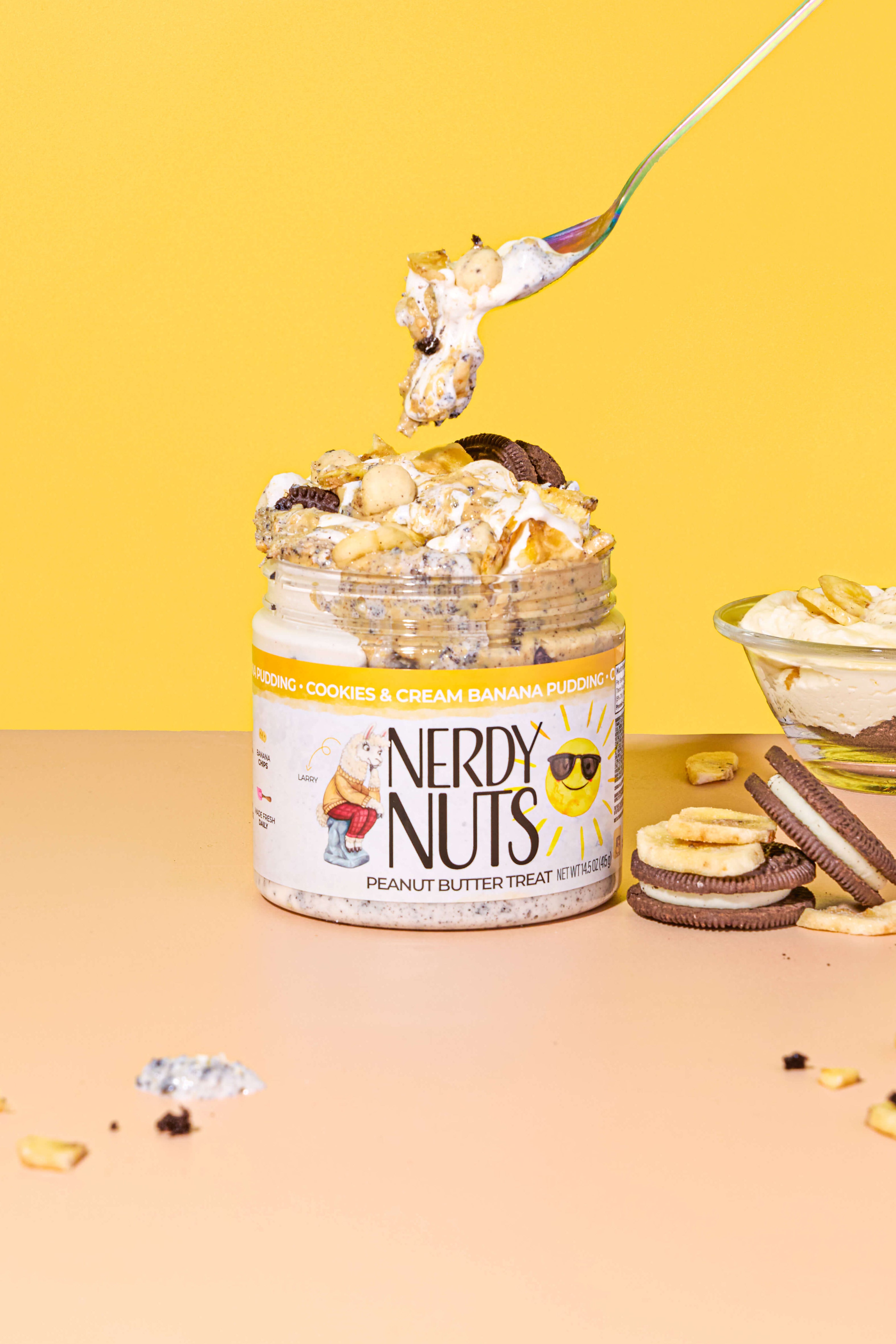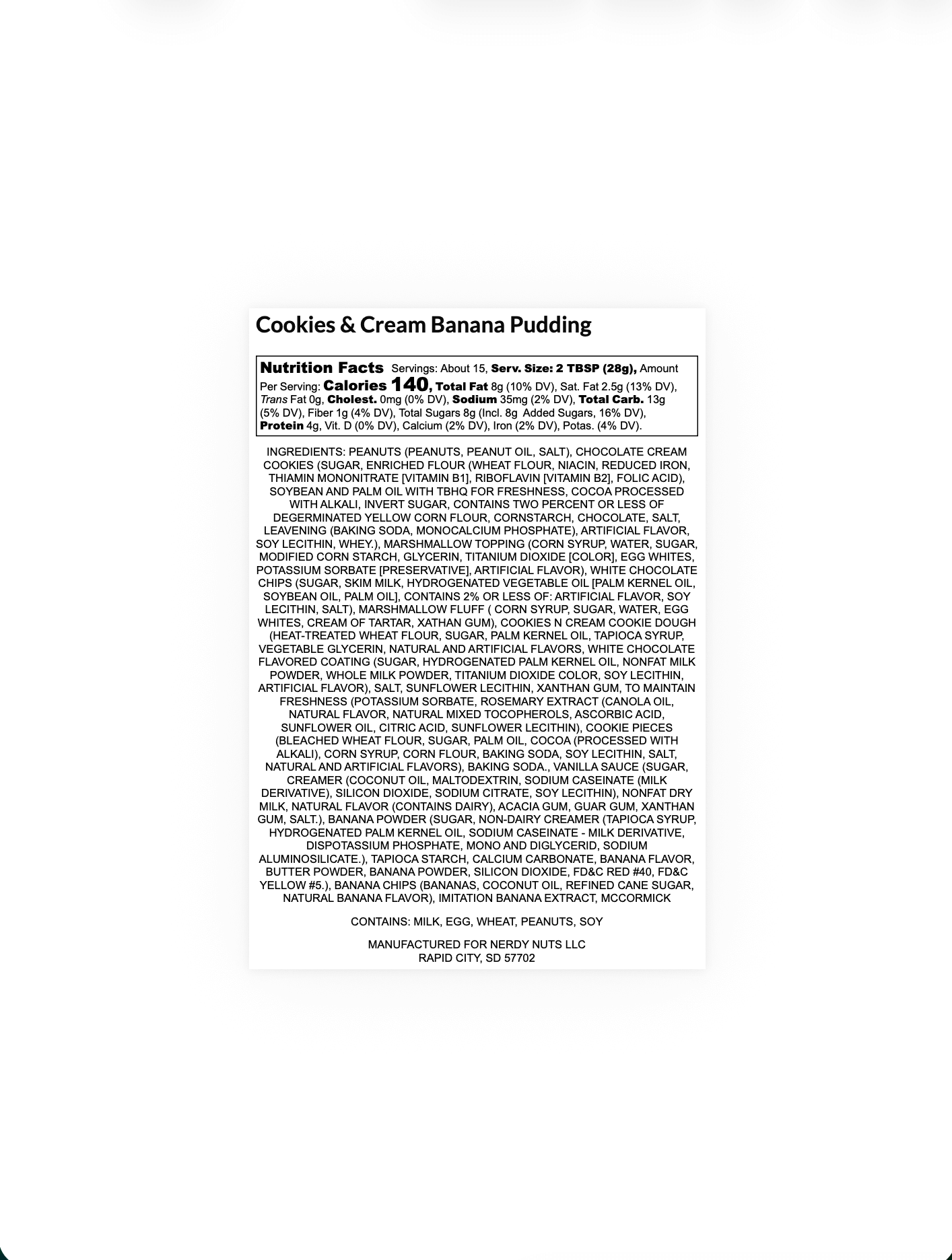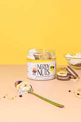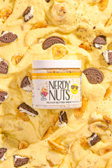 “Smunchy” banana cookies & cream peanut butter is layered on marshmallow fluff, topped with cookies & cream banana creme, banana chips, chocolate cookies & cream, and cookies & cream dough bites!