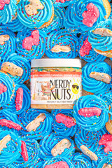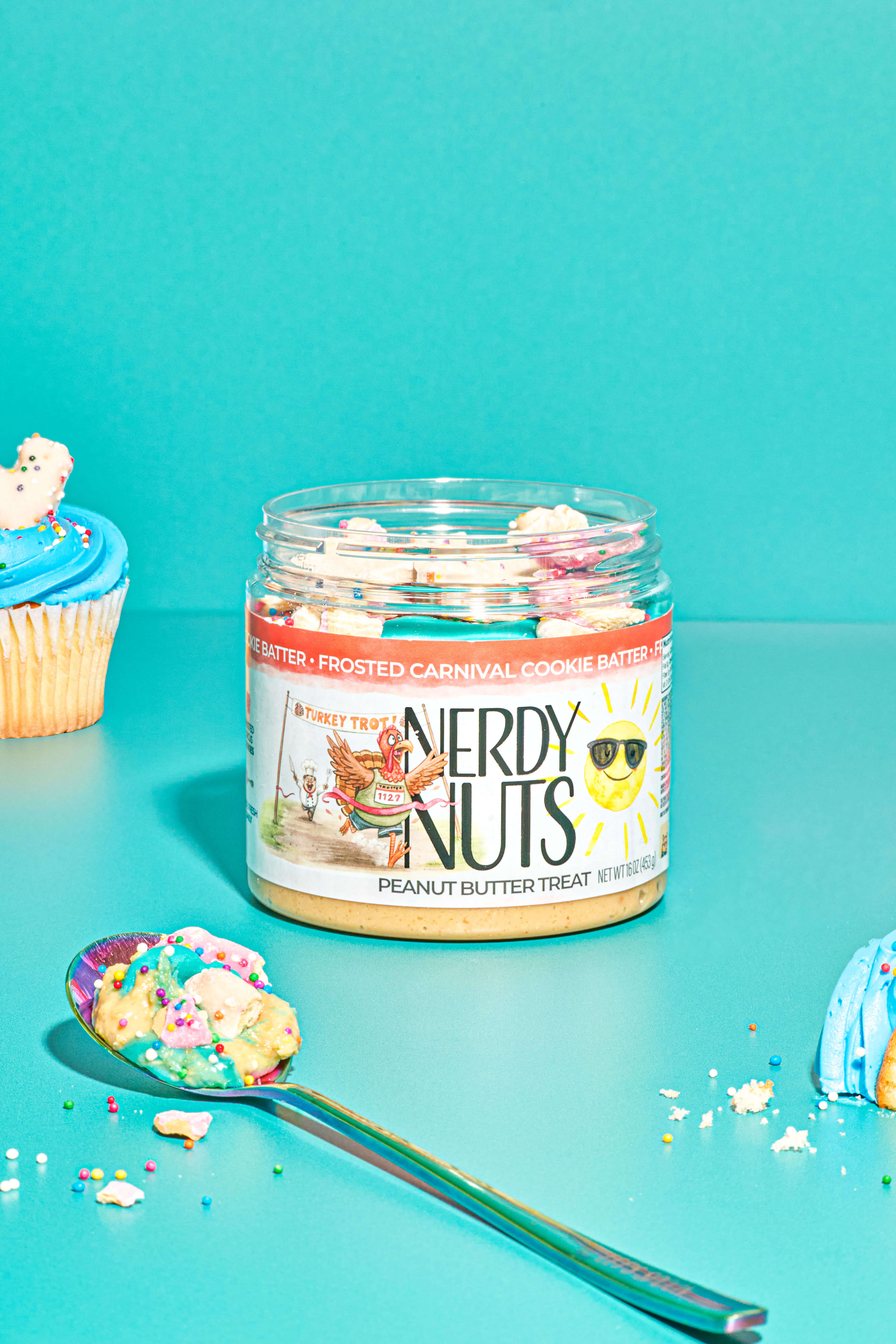“Smunchy” yellow cake peanut butter is swirled with show-stopping, almond cake batter frosting, frosted circus cookies, & rainbow nonpareil sprinkles!