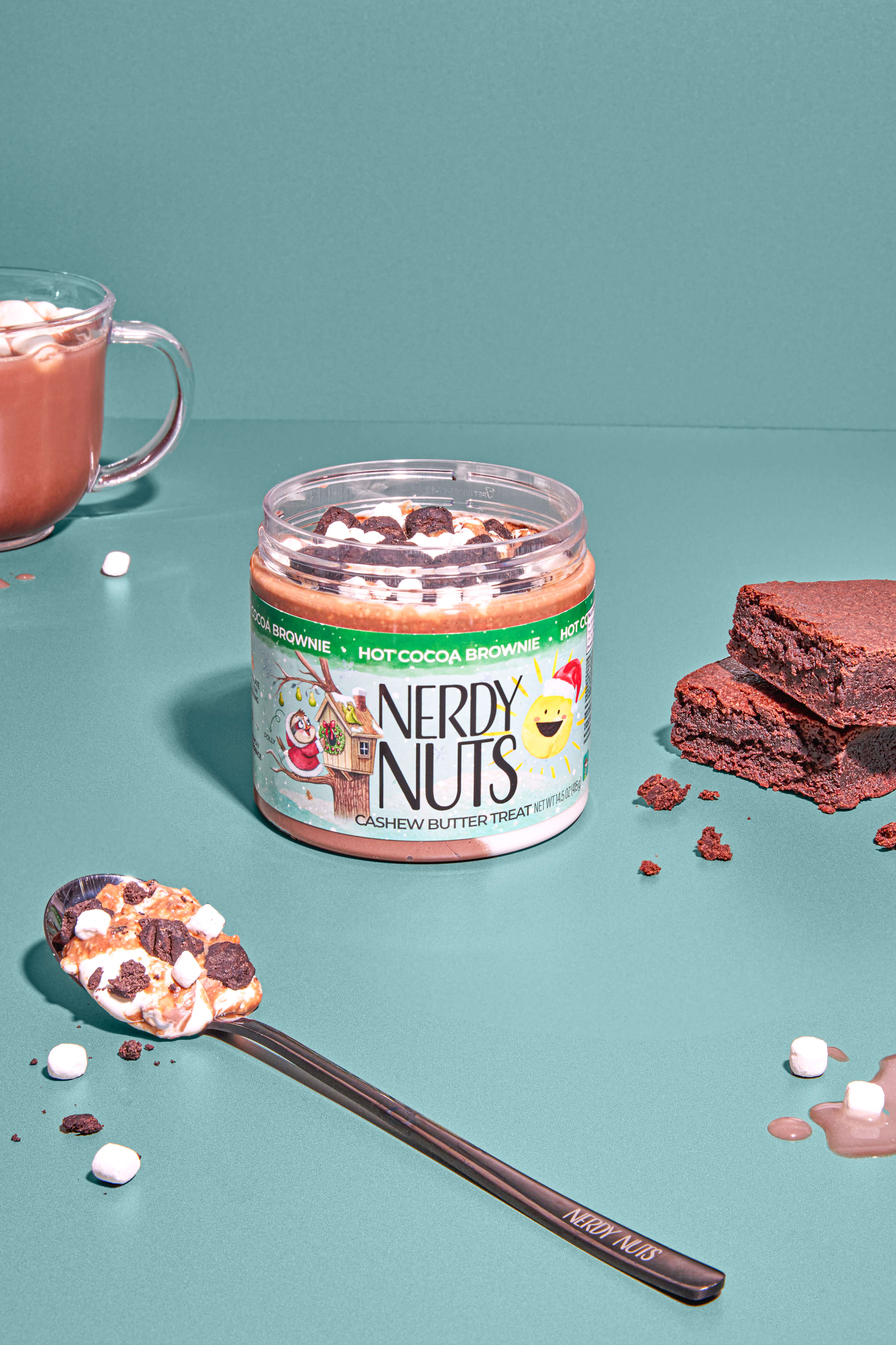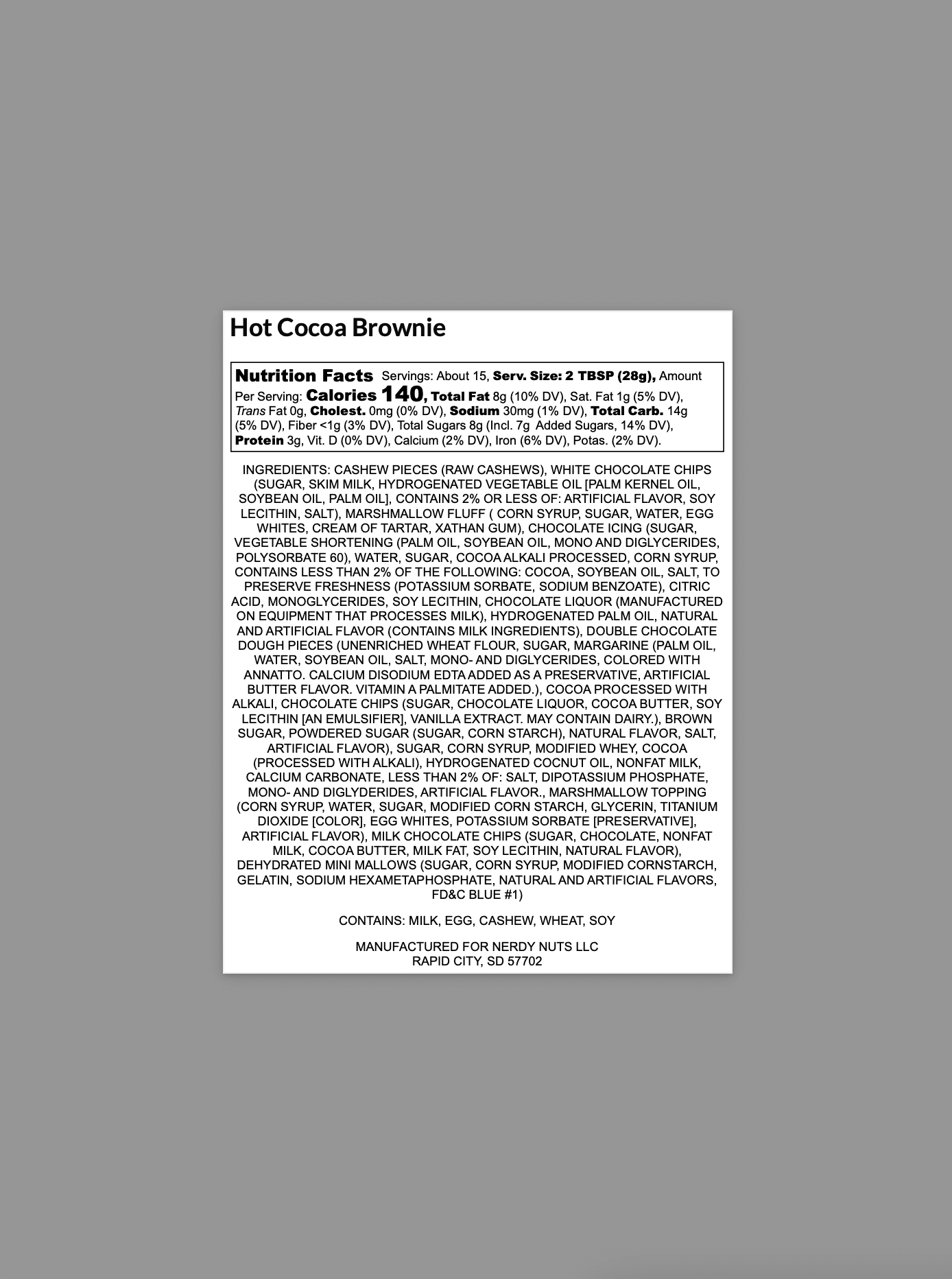 “Smunchy” hot cocoa cashew butter is layered on fluff & chocolate mallow frosting, topped with dehydrated mallow bits & double chocolate cookie dough!
