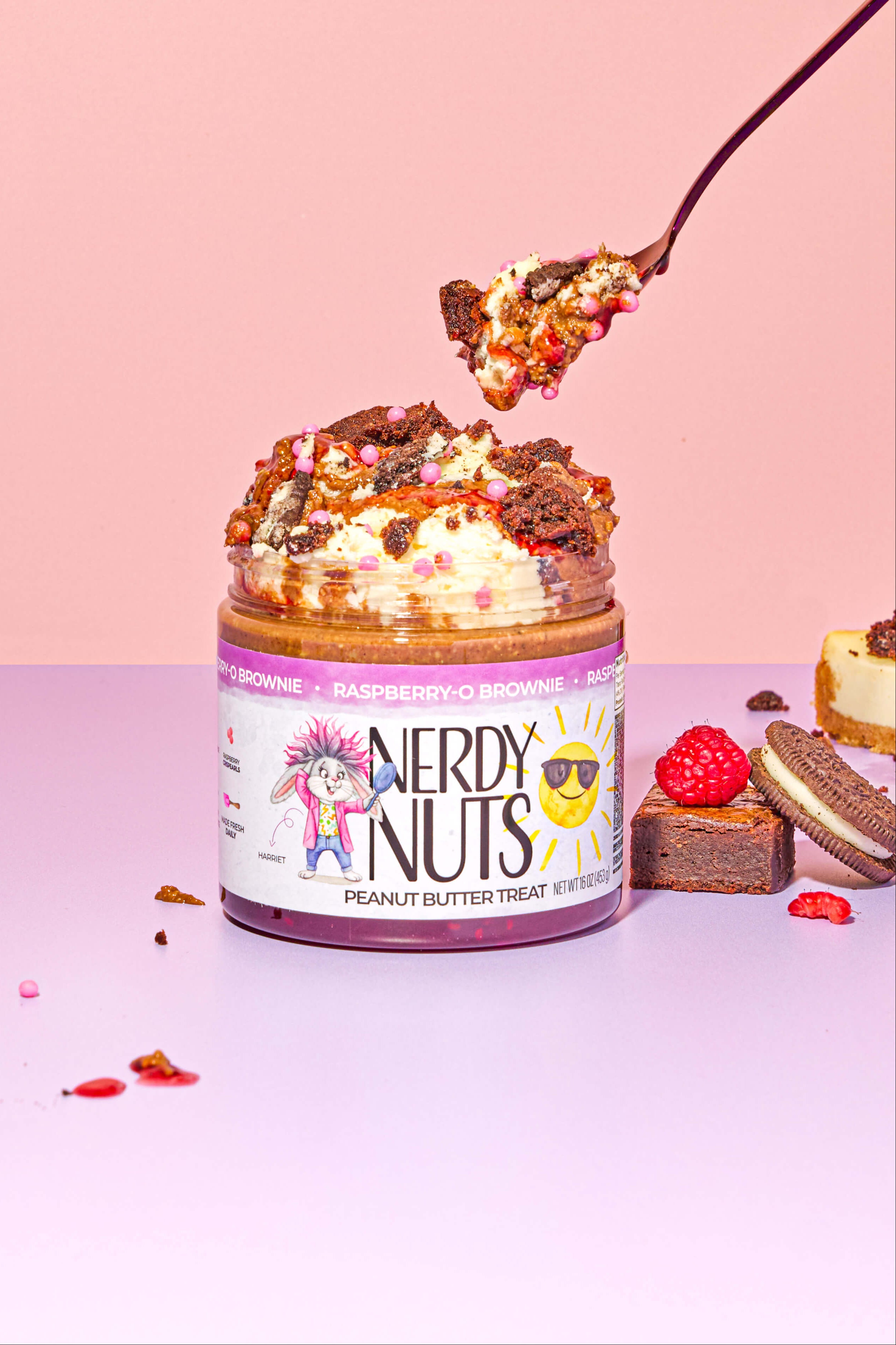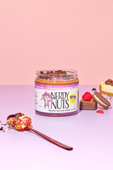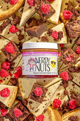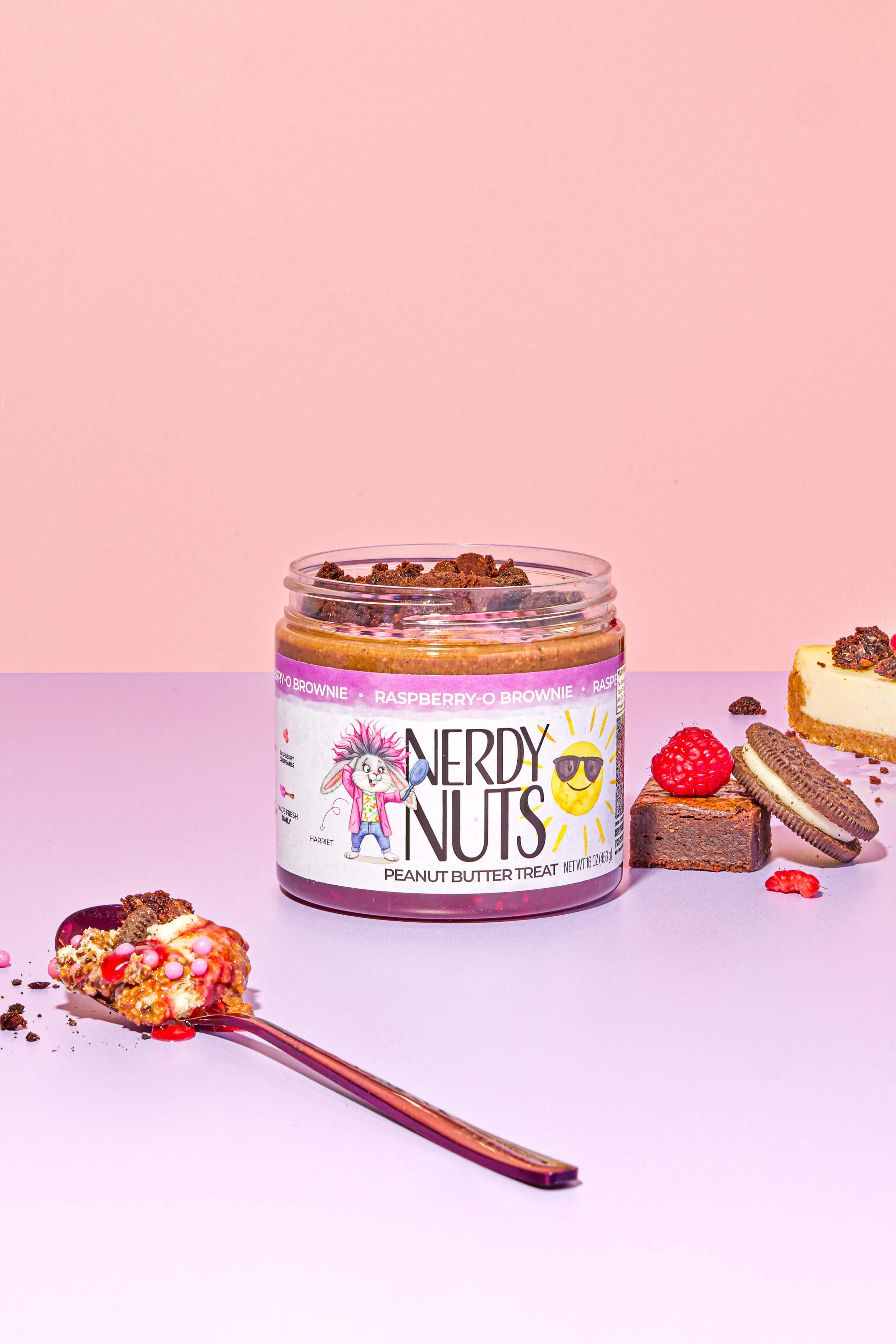 “Smunchy” sweet dark chocolate cookies & cream peanut butter is layered on raspberry sauce, topped with chopped chocolate cookies & cream, cream cheese icing, raspberry crispearls, & brownies!