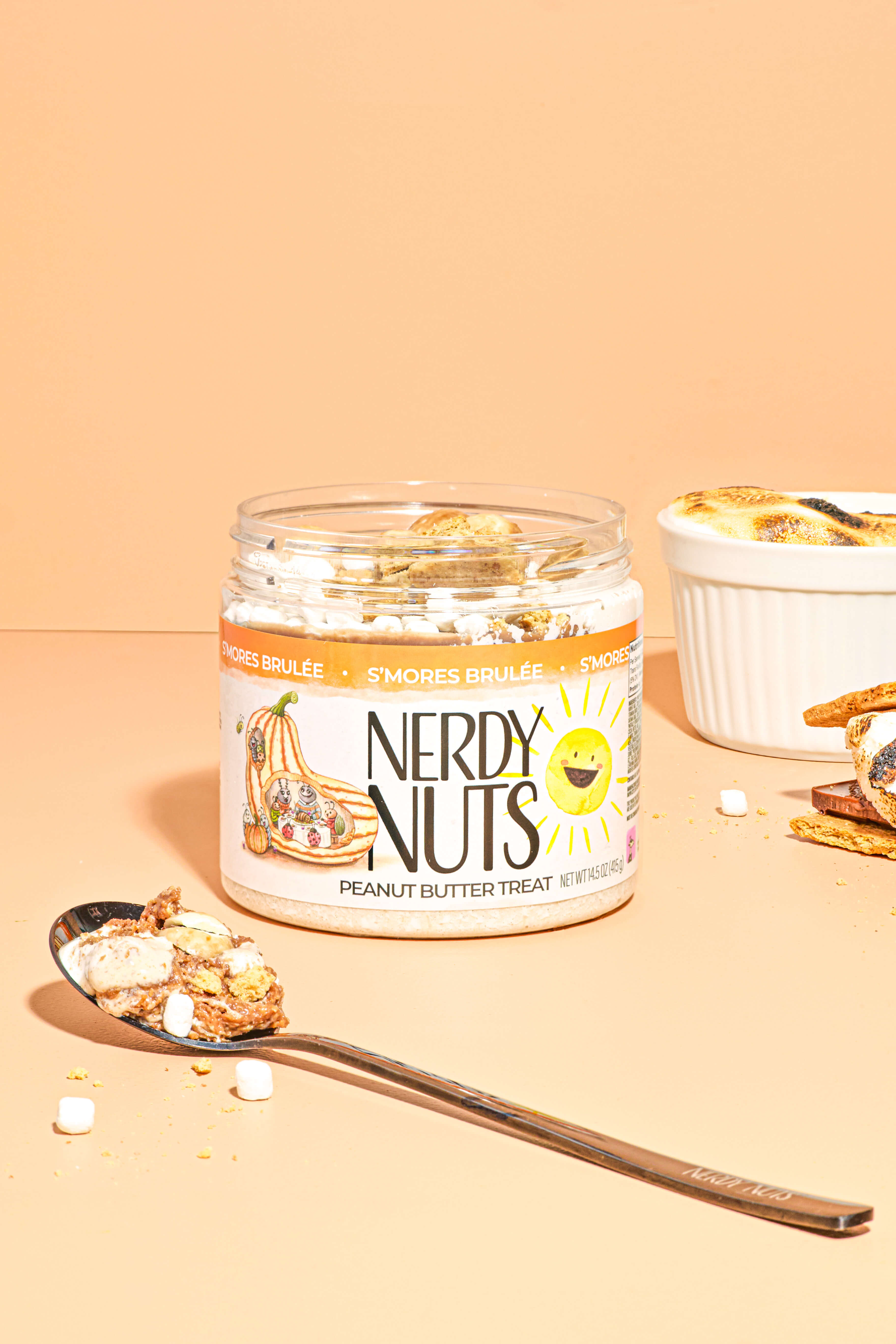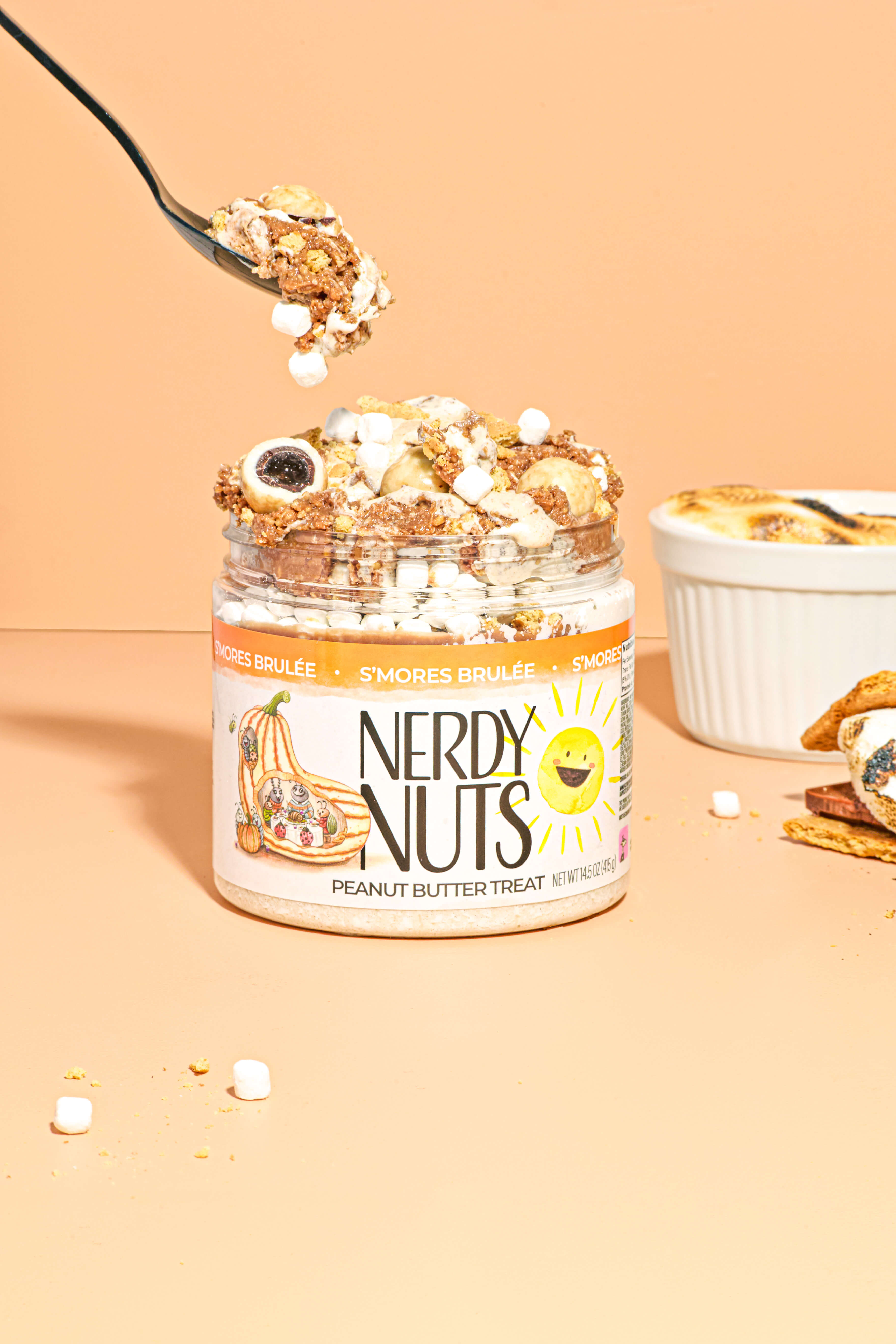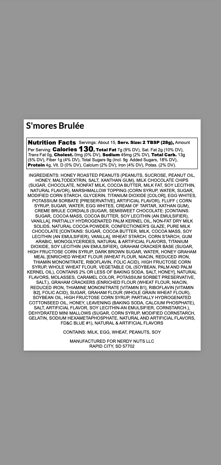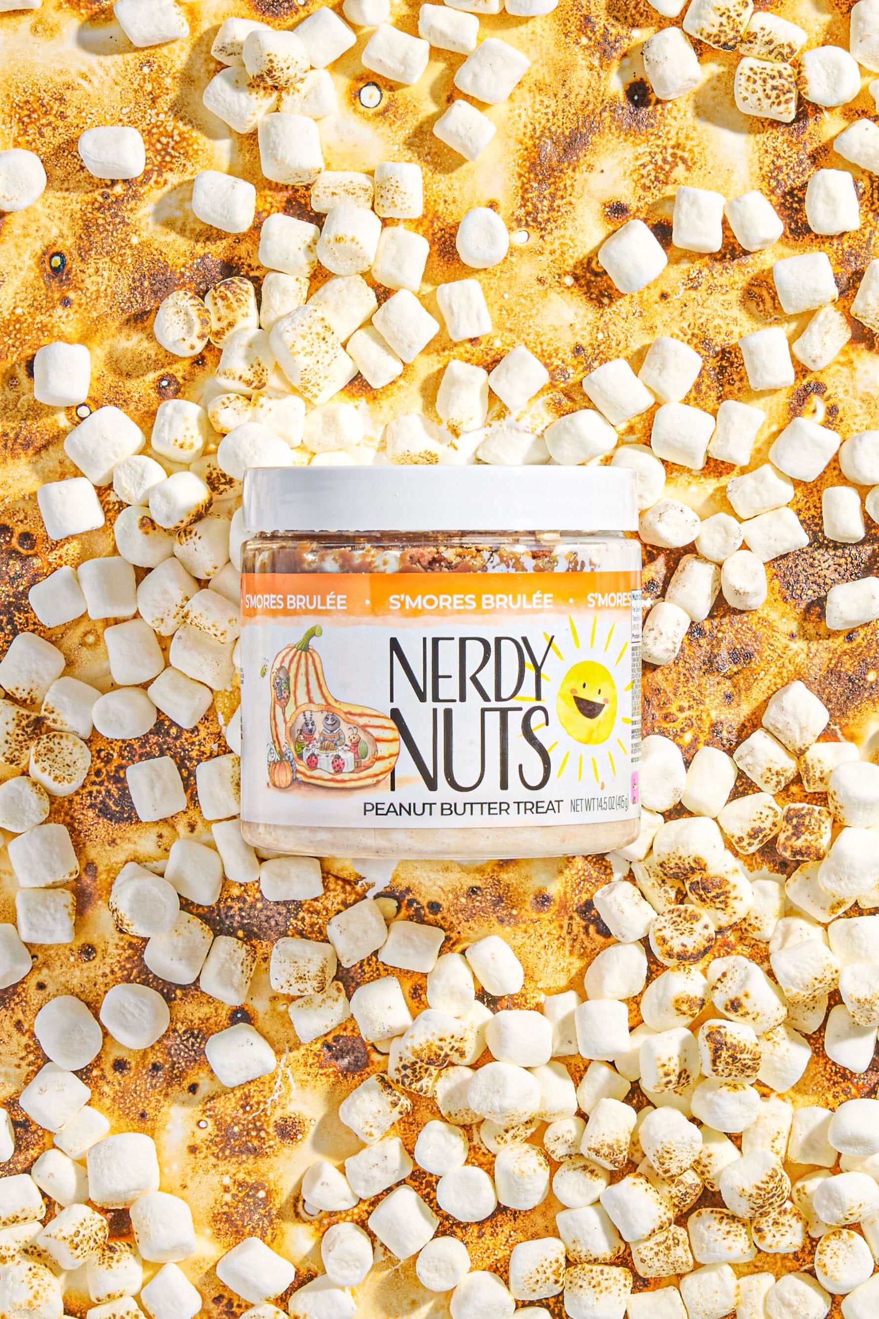 “Smunchy” sweet milk chocolate peanut butter is layered on marshmallow fluff & graham cracker creme brulee mallow creme, topped with dehydrated mallow bits, graham cracker chunks, & creme brulee cordials!