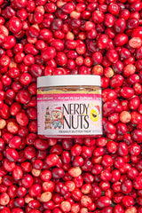 Yellow cake peanut butter is layered on cranberry raspberry sauce, topped with dried cranberries, salted caramel covered pretzels, & whipped cream flavored frosting!